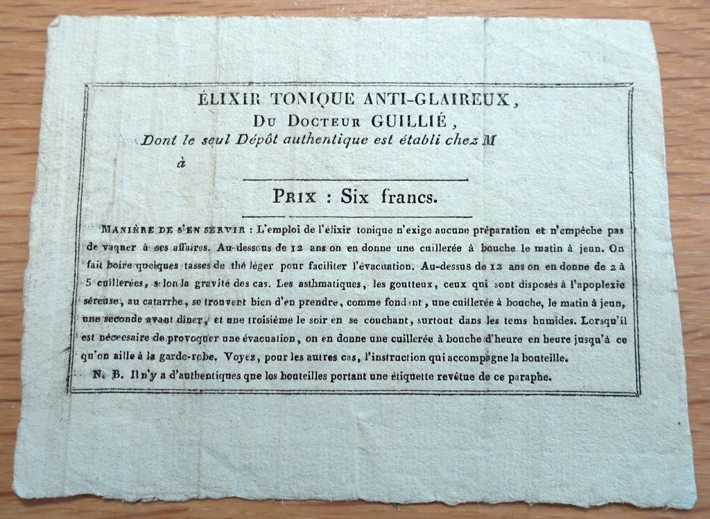The earliest mention of Guillié’s elixir that I can find dates from 1822, so this must have been Guillié’s main source of income after leaving the school.