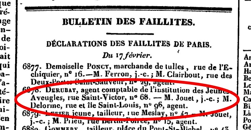 I also found a letter written to the director in June 1831 by the head of the board of governors, Alexis de Noailles. Alexis was a born diplomat, with seldom a bad word to say about anyone, but he bursts out: “Vilain homme ! Voler des pauvres, des aveugles, compromettre une administration qui a confiance en lui !” (Dreadful man! To steal from the poor, the blind, to compromise an administration that had confidence in him!”). I had to know more.