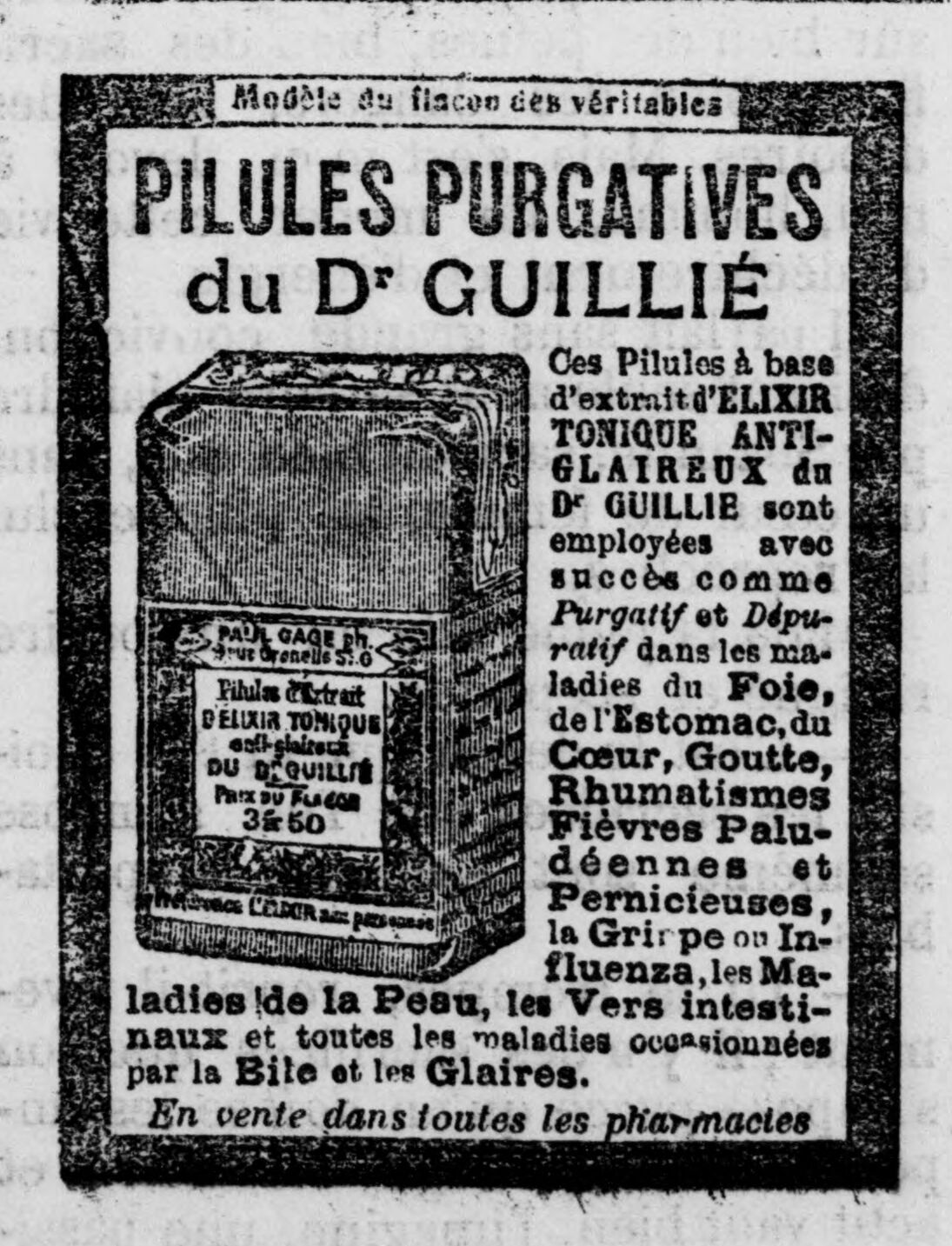 Guillié, who had a great deal of education seasoned with a great deal of intelligence, one day became impatient with his lack of riches – a fate he shared with many of his most estimable colleagues – while he saw many idiots, ignoramuses, and rogues growing rich around him. Clients who … paid him poorly and constantly told him that they were bothered by phlegm (which is only a symptom and not an illness), inspired him … with the dastardly idea of prescribing them an anti-phlegm elixir. He had only to choose from the numerous formulas of purgative spirits available in German and other pharmacopoeias; but for commercial success, it was necessary to make people believe in a secret remedy. … The law prohibits the announcement of secret remedies (incidentally, it is worth repeating that there is no secret remedy, chemistry sees to that), so Guillié buys a dying newspaper, inserts the formula for the said anti-phlegm elixir, confiscates all the copies, and immediately puts the paper out of business after making a simple legal deposit. The law remains, from then on, satisfied and powerless. By this cruel revenge against human stupidity, Guillié realizes 80,000 francs in income.