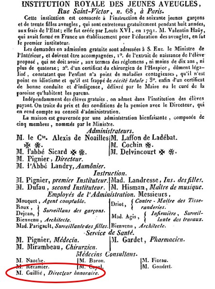 The fall of Napoleon and the restoration of the monarchy rescued Guillié’s career, and in 1814, presumably because of his medical expertise in diseases of the eyes, he was appointed director to the school for blind youth. He even seems to have been recognized by the Legion of Honour (look at his lapel pin), heaven knows why. He had not particularly distinguished himself.*