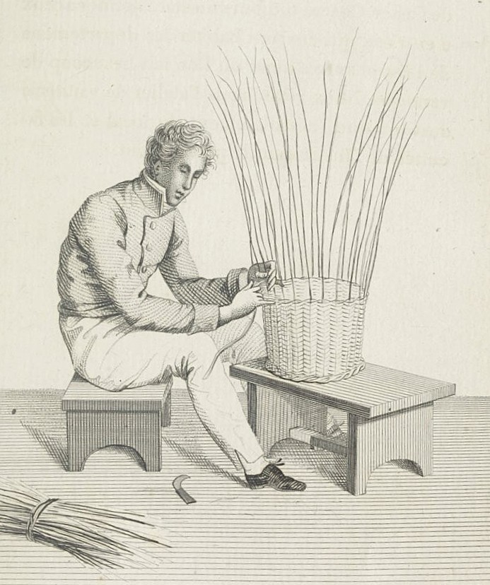 The book contains illustrations of healthy-looking young people engaged in all sorts of useful toil, although, like the printing press, some of the workshops did not, in fact, exist at the school at that time. Here is basket-weaving. Apparently, this was not an option for the students at the school.
