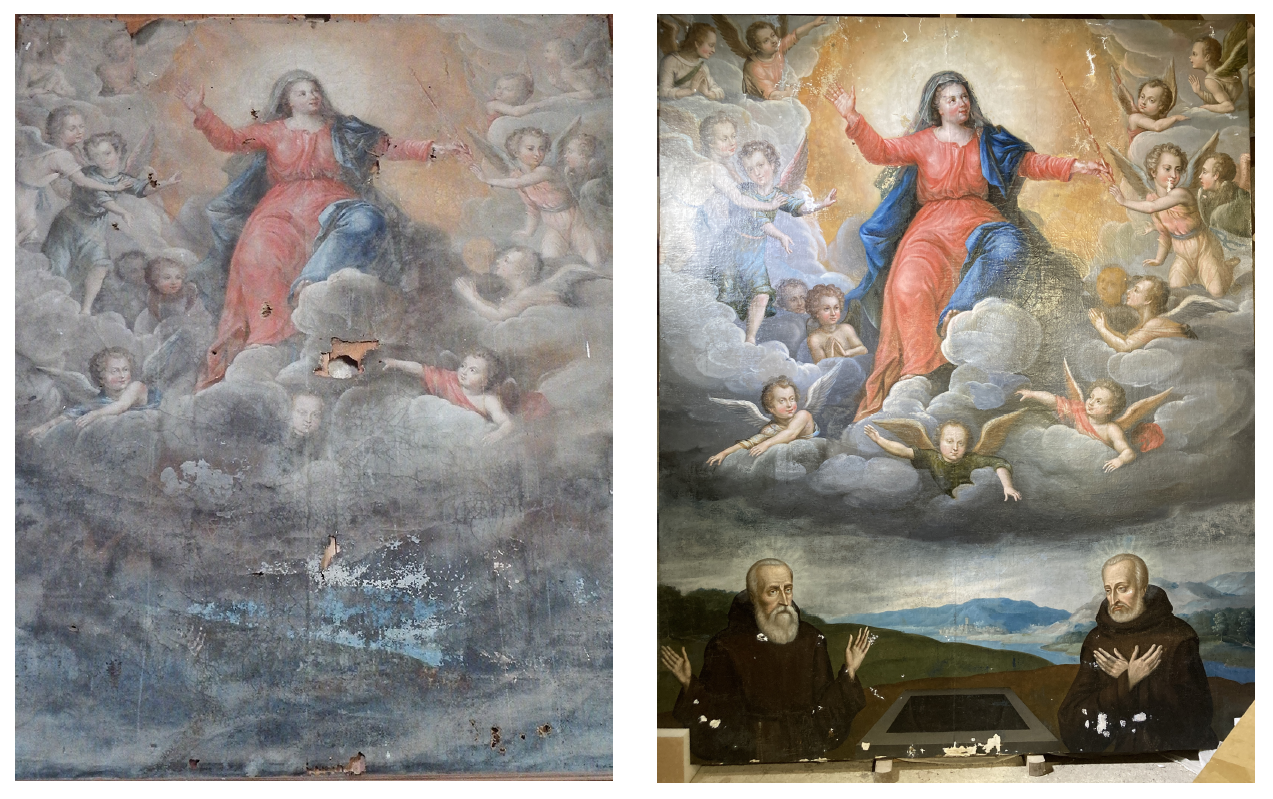 The painting was saved, in part, thanks to a program of the Fondation La Sauvegarde de l’Art Français. The Foundation chose three artworks in each region of France and those interested were invited to vote for one of the three to receive funding from the Foundation. Friends and family rallied around to get out the vote for the painting of Mary.