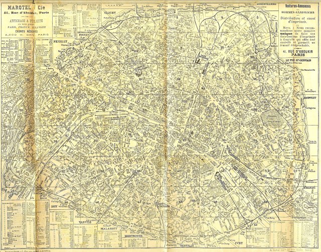 The fold-out map in the middle is a printing tour-de-force with an extraordinary level of detail, plus more ads squeezed in – including one for “hommes-sandwichs” available for hire.