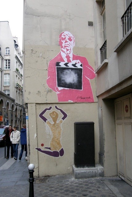 On another day’s ambling along in the Marais, I encountered Alfred Hitchcock and the Musical Lady. I am sure they did not come to the party together. The styles are too different. Perhaps the wrinkled directorial Hitchcock arrived first and someone thought he needed a female lead.