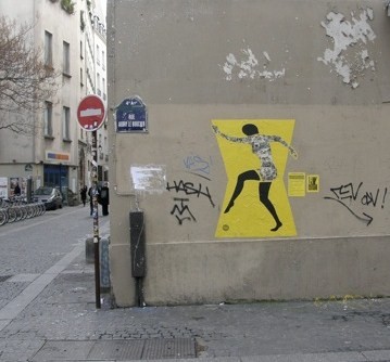 Perhaps she is still in the 4th arrondissement, where we met her on Rue Aubry Le Boucher in December 2008. Finely proportioned, lively, and carefully executed, she seems to belong where she is. At the same time, she stands out alone within the larger street environment. However, when joined by pedestrians, she somehow seems more animated, exhorting us to a sprightly walk: Come on, folks, put a little more energy into it.