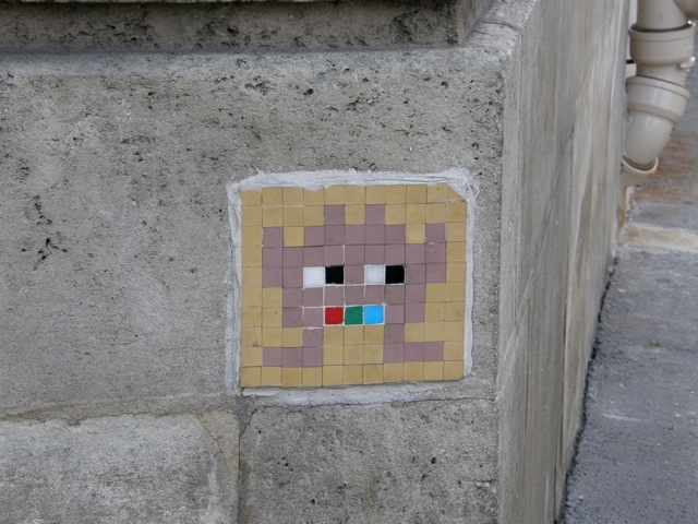 The early Invader-type ceramics usually had about 120 tiles. Even though the image above has over 1,050 tiles it has the unmistakable Space Invaders look. Regrettably, spray painted overlay has reduced the impact of the furtive glance of the eyes. Nonetheless it remains an arresting piece of street art.