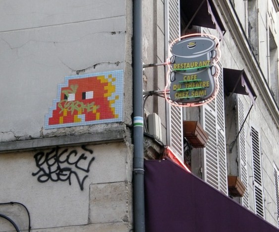 The large pixels in the early games gave the figures a characteristically chunky look readily captured by ceramic tiles. In time, ceramic street art grew more refined through the use of larger numbers of smaller tiles.