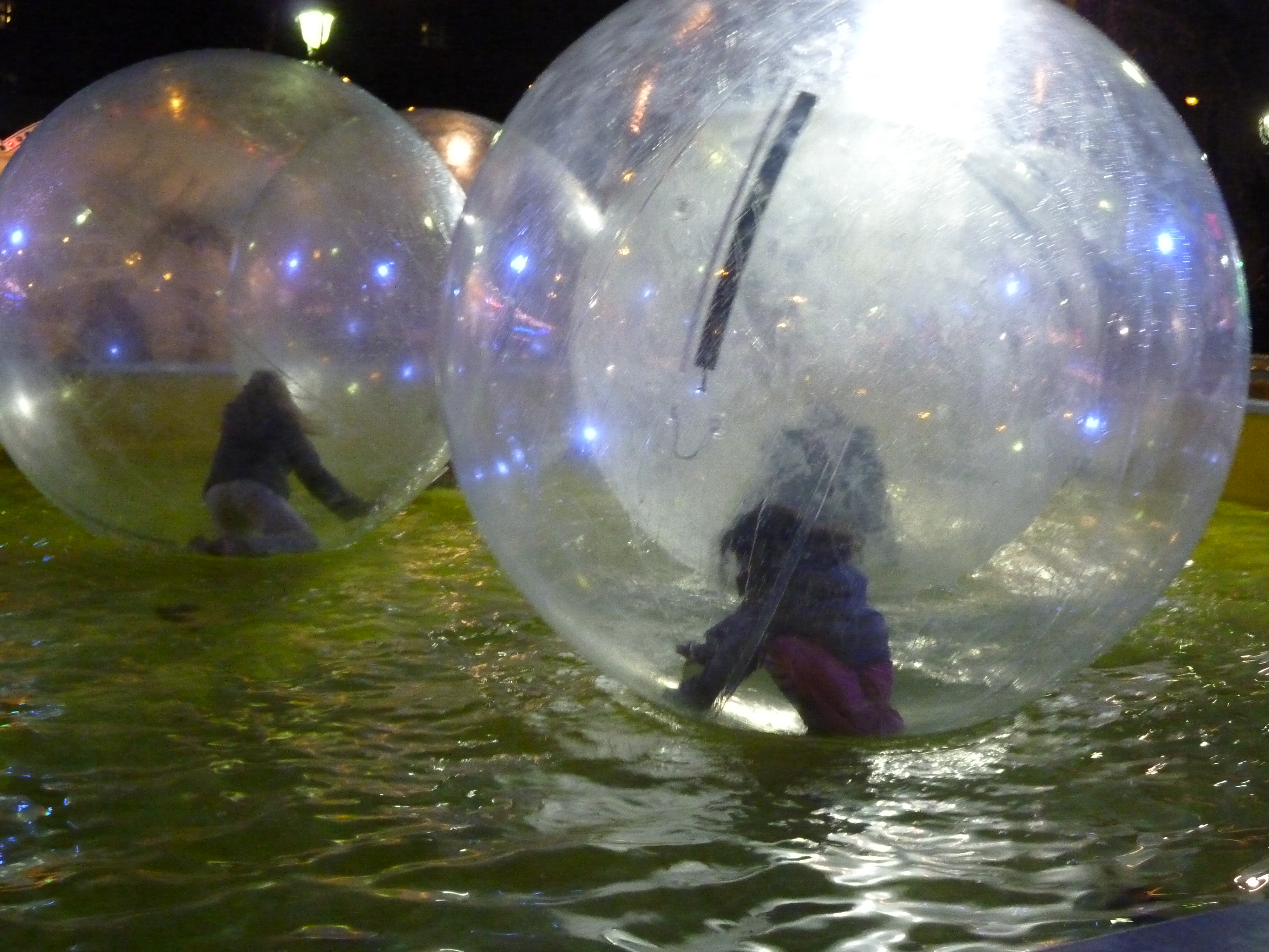Near the Bastille, we came across a children’s fun fair. Two of the most popular entertainments seemed to be the bumper cars (when was the last time you saw bumper cars?) and the pool in which children in waterproof spheres cavorted in the water.