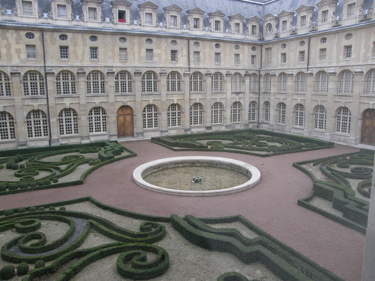 The original design was by Francois Mansart. He was later kicked off the job for going over budget (some things never change), but the building was completed following his plans. Perhaps the best way to appreciate the whole is to see it from above: the domed church, the courtyards, including the formally laid out beds in the main cloister, and the gardens to the east (that white cross in the gardens is a helicopter pad, by the way).
