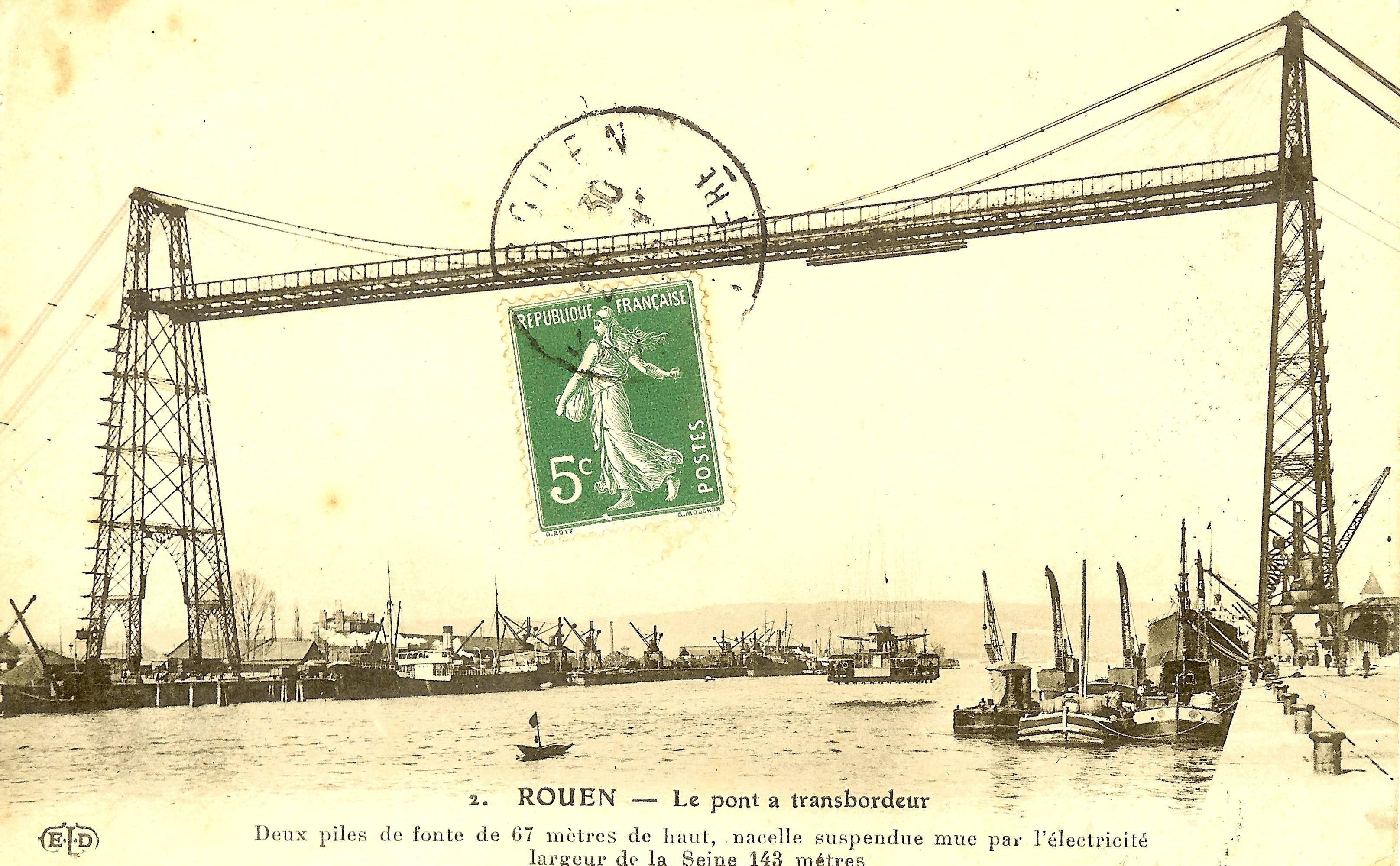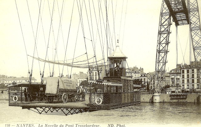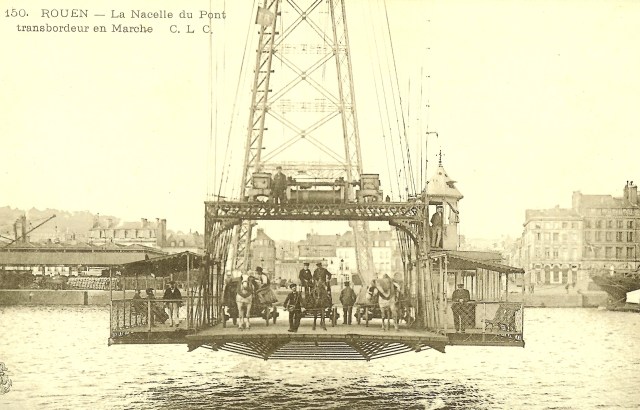 It seems a peculiar way to cross the water. And the translation of the text on these postcards isn’t a lot of help. La nacelle can mean the basket under a hot-air balloon or a type of small boat. And le pont transbordeur is a transporter bridge.