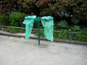 Did you see that? They empty public trash bags up to six times a day in busy areas. (Here in Toronto, we’d be pathetically grateful for more than once a week in a good week.) Years ago, when terrorists were putting bombs in garbage cans, Paris switched to a system of green-tinted transparent bags, held in place by a metal hoop. As solutions go, it is reasonably unobtrusive, and no exploding green bags have been reported to our knowledge. We’ve watched the operation and we calculate that an experienced man in green can make the substitution in approximately 15 seconds (loosen the hoop, grab the bag and tie it, unfurl a new bag and position it, then slam down the hoop again).