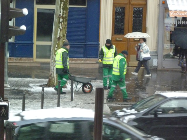 On our most recent visit this past Christmas, we noticed that the men in green were taking on extra duties. Paris does not have the snow removal technology we have in Toronto (un “snowplough”?qu’est-ce que c’est que ça?). So, on an icy day on the boulevard Port Royal, three of them were out there making the sidewalks safe. One had a wheelbarrow full of road salt and the others had little dustpans. They distributed the salt along the boulevard using the dustpans as they went.