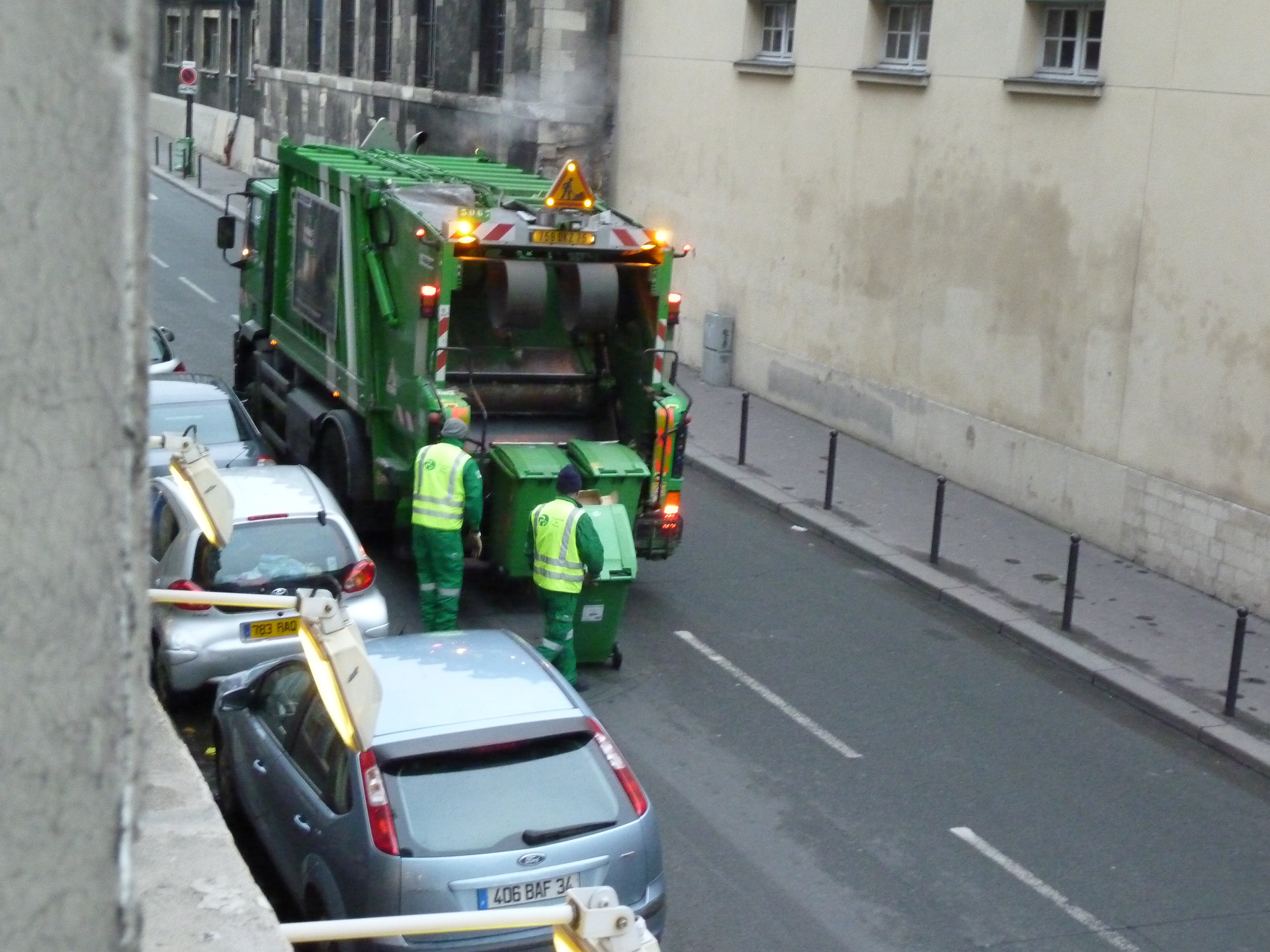 And on New Year’s Day, the first sound we heard in the morning was a garbage truck making its way down our street, picking up the trash from the previous night’s revels. What a civilized sound. We snapped this hasty photograph of evidence that the men in green were on the job early in the New Year, keeping the city beautiful.