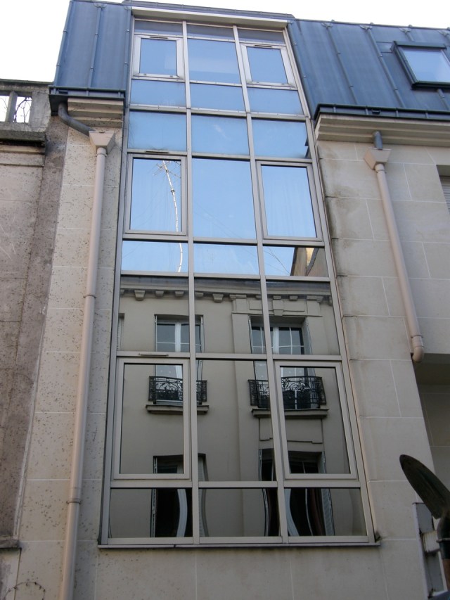 The road is narrow and cobbled and branches at the end – one part ends at a big gate, beyond which seems to be a school playground; the other part leads out to the tree-lined rue d’Alésia. Each house or studio is unique – no uniform Haussmannian façades here. The buildings come in different heights and colours, many with large expanses of windows, a couple set back from the street with tiny gardens in front.