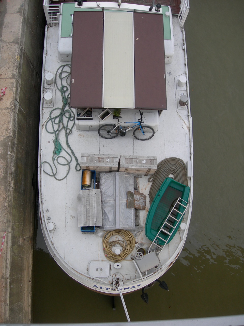 The Alternat was skilfully piloted and as we watched (in line with our general philosoply of “no schedule, no rush”), it pulled in and was tied up just below the bridge. There was another bicycle.