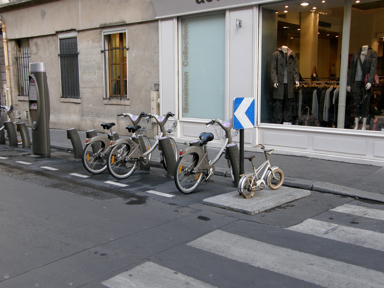 The louche bicycle lounging outside the Musée seemed a far cry from the carefully marshalled, almost official-looking picture postcard view of the Velibs. But look below and you see something decidedly less official-looking. For several days we had seen the child’s bicycle with its long-dead rear tire. Was it abandoned? A work of art? And the almost backwards seat on the Velib’ beside it? There is a story here. But you will have to make it up for yourself.
