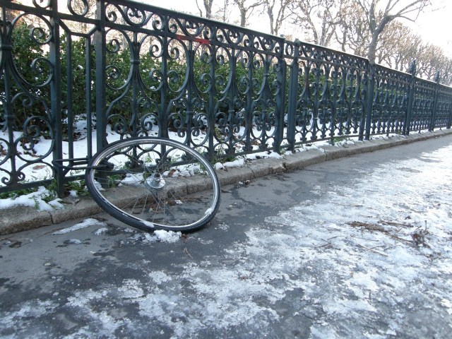 Less than a week later, it was Christmas Day and we were walking through the Jardin du Luxembourg. Sun-starved Parisians positioned themselves to soak up the rays, the ducks in the Medici Fountain paddled calmly, friendly snowball exchanges erupted here and there. And a bicycle wheel wondered if it would ever be reunited with its missing pieces.