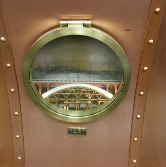 I lingered longest at this porthole because I like bridges. The fact that the designer chose to show the bridge under construction with falsework still in place was a lovely touch. Later I learned that the Pont Antoinette was built in 1883-1884 near Vielmur-sur-Agoût, Tarn (81) in the Midi-Pyrénées region of France. It was the first major project by Paul Séjourné (1851-1939) who was to become one of France’s eminent bridge engineers.