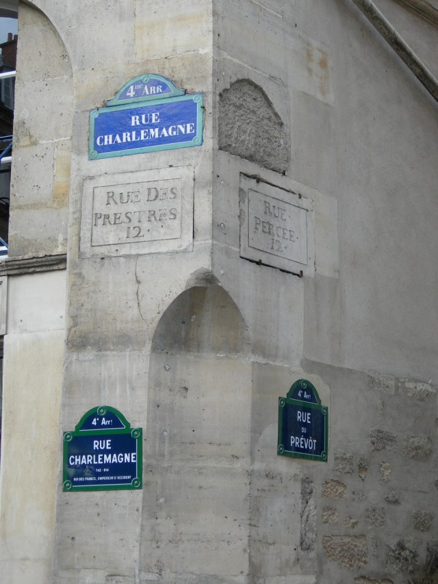 Street signs represent layers of history. The name of Charlemagne conjures up powerful images of history long gone. But even before it was rue Charlemagne, it was rue des Prestres. As the language evolved, the letter “s” sometimes disappeared to be replaced by a circumflex accent and Prestres became Prêtres or priests. At some point, Charlemagne’s name displaced that of priests. Perhaps it occurred during a period of anti-clericalism. But then, why change rue Percée, a street named to mark an opening in a wall, to Prévôt (Provost), which can stand for a clerical office? There is a story there, but I don’t (yet) know what it is.