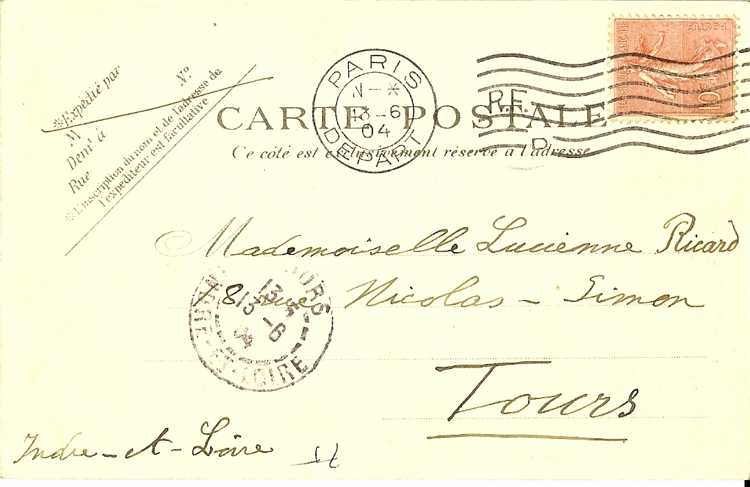The postcard was addressed to “Mademoiselle Lucienne Ricard, 18 rue Nicolas-Simon, Tours, Indre-et-Loire.” Rue Nicolas Simon does not appear on Google maps, but I found it on an image of an old Baedeker map of Tours. When I compared it to the current map, I realized that the street had been renamed rue Jules Simon. No. 18 is still there, visible in Street View.