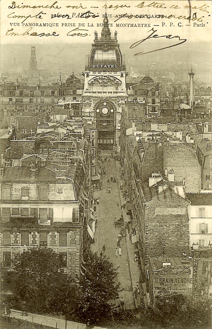 The message is written on the picture side of a postcard that we found in the stamp and card market in the gardens just off the Champs-Elysées. The photograph showed a huge building we didn’t recognize, with the words Dufayel on an elaborate clock tower topped with a dome which was further topped with a spire. Printed on the card are the words “Vue panoramique prise de la Butte Montmartre – P.P.C. – Paris.” (Panoramic view from the Montmartre Hill. P.P.C. might mean “picture post card.”)