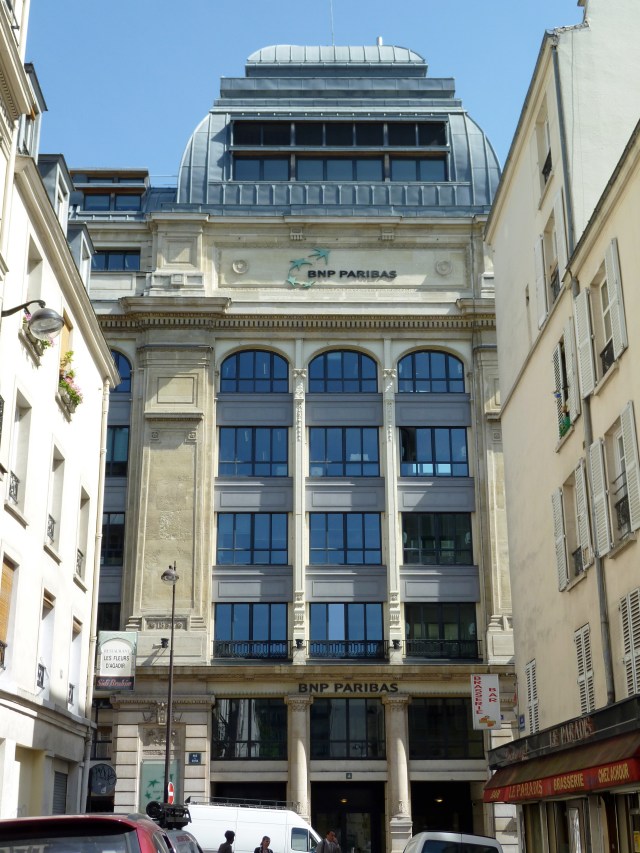 Curious to see what was there now, we set off with a friend on a fine May morning to find out. We located the building shortly after leaving the Barbès-Rochechouart Metro station. We approached its southern front first, which was also impressive, before we found the west-facing façade shown on the postcard. The building is now occupied by the BNP Paribas bank.