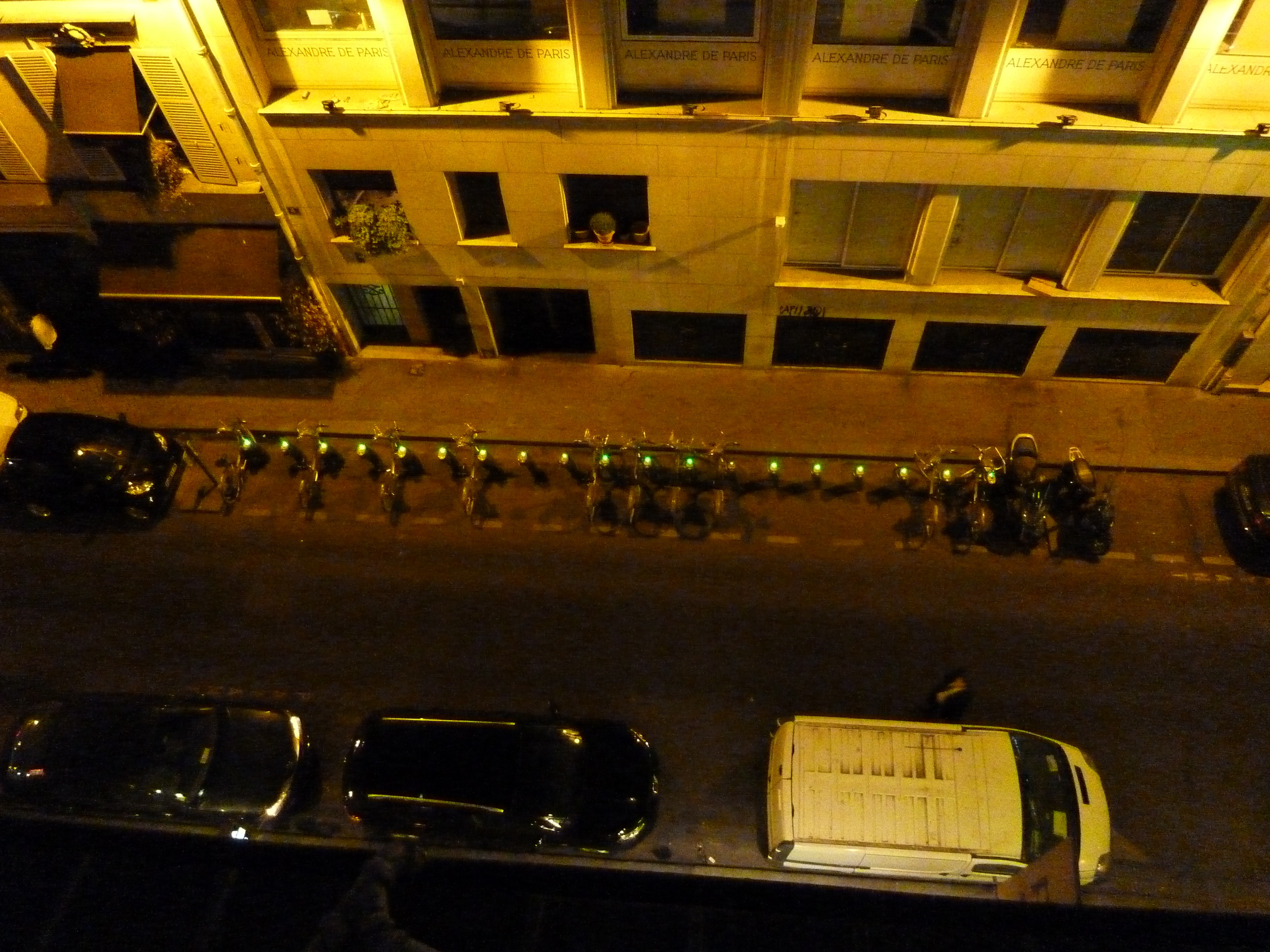 If you look closely in the picture below, you will see a sort of blur in front of the Velib’ stand. That’s our guy, running flat out, to retrieve or move a car. My camera shutter speed couldn’t keep up with him.