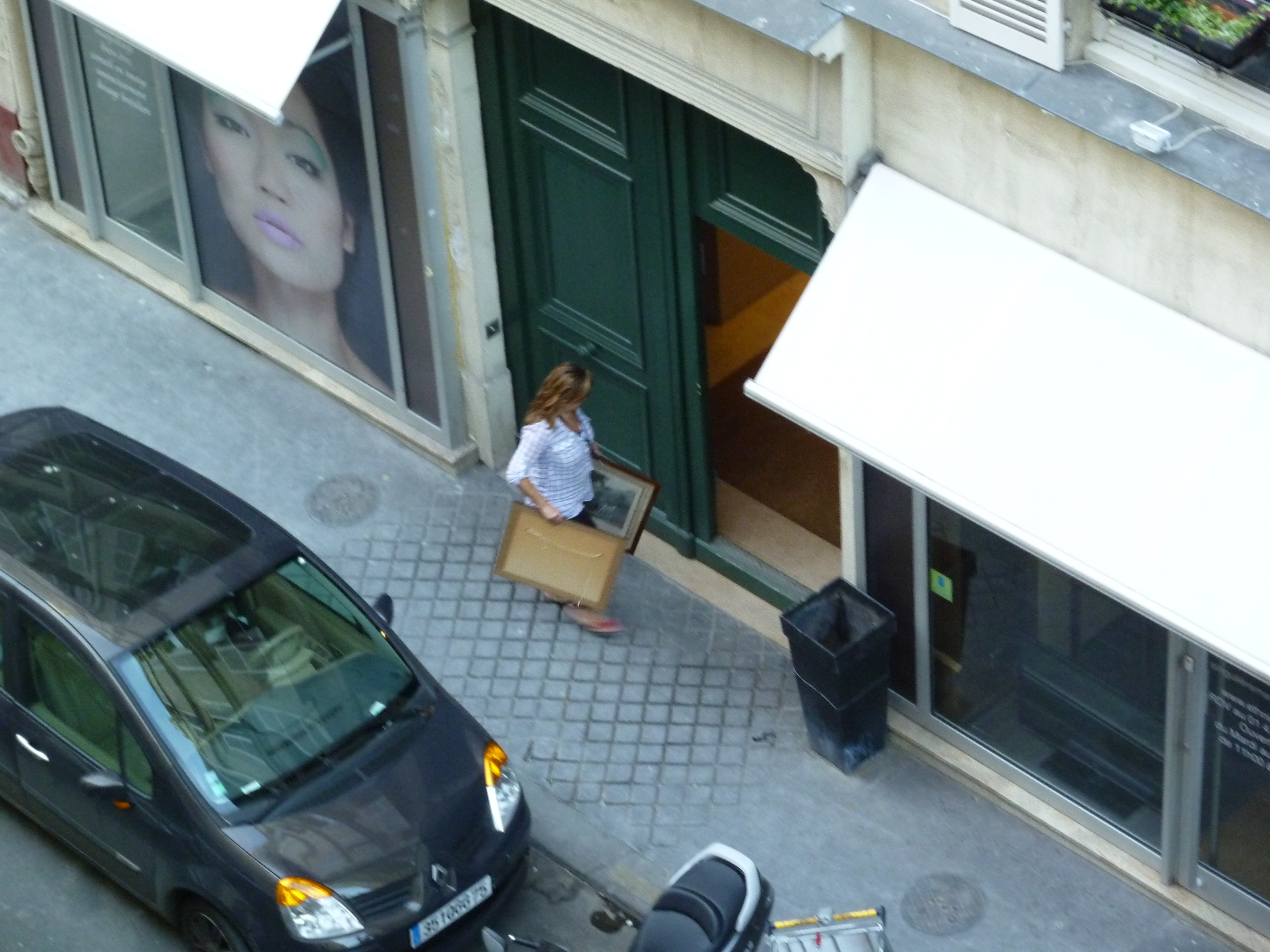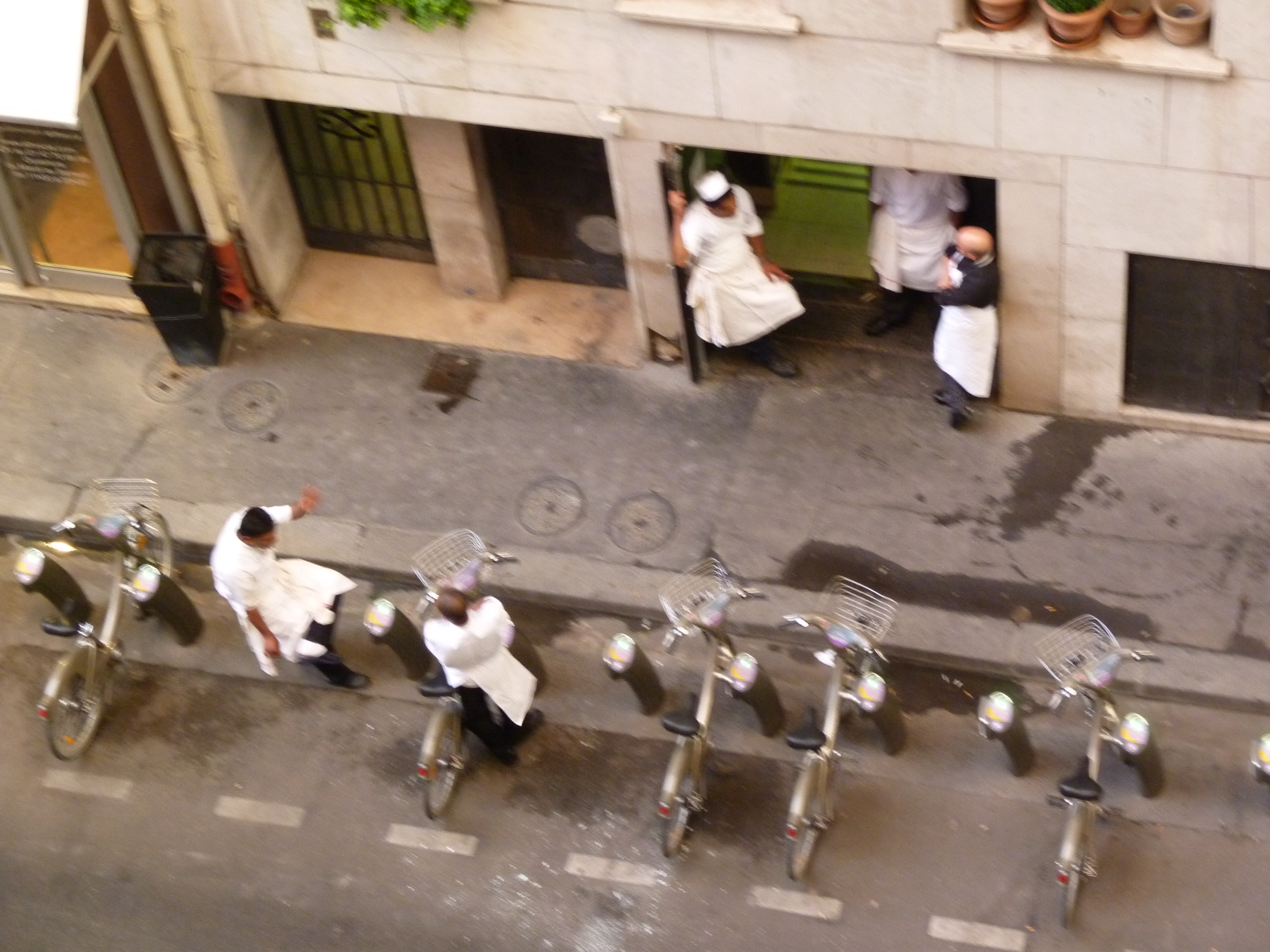 With the introduction of anti-smoking laws in France, outdoor smoking is common and the spot was a popular one for smoke breaks for the kitchen staff and wait staff of a local restaurant. The restaurant entrance was on the next street over (a spacious boulevard), but our balcony overlooked the staff entrance. The women’s footwear is a clue to the type of restaurant.