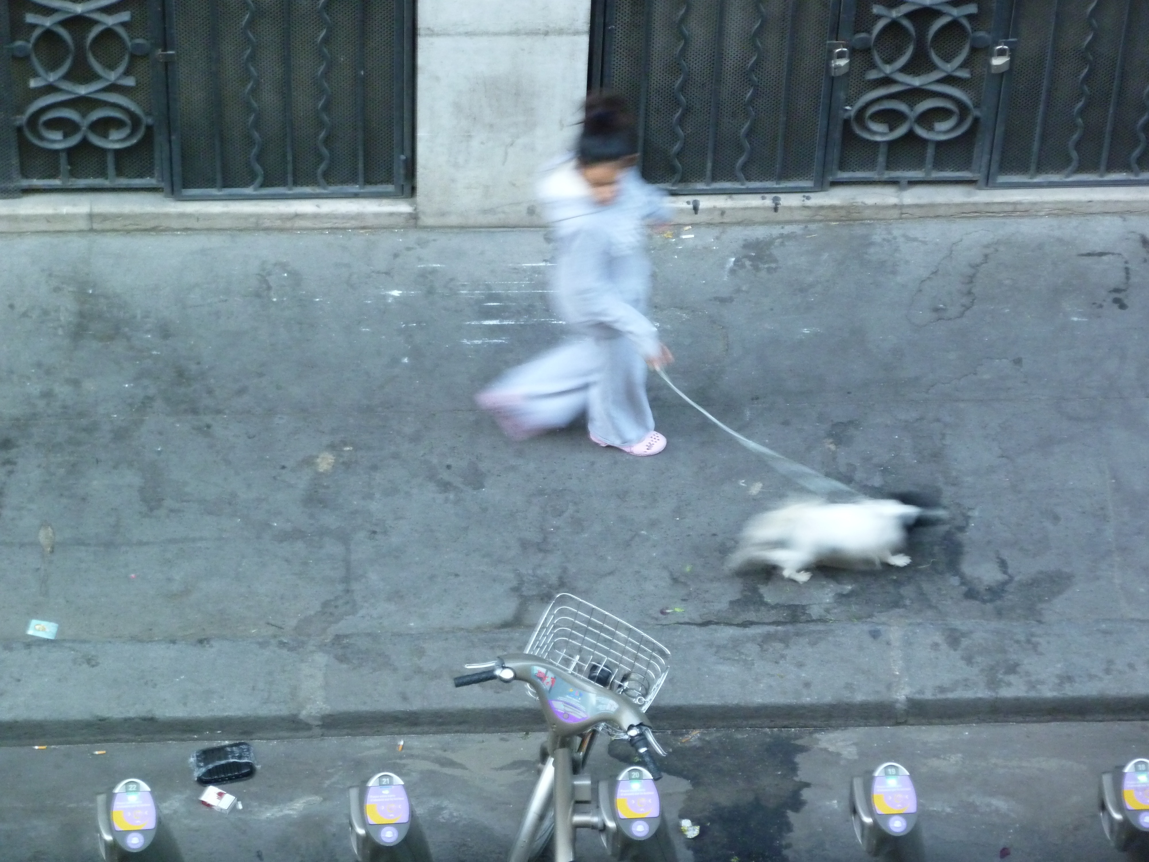On our most recent visit to Paris, we rented an apartment with a balcony, and like the Caillebottes, we spent a lot of time on it, watching people come and go. However, our apartment did not overlook a wide boulevard, but a narrow, one-way street, and the first thing we saw when we looked out was not a tree and a bench, but…a Velib’ stand. Here it is, with some of Paris’s finest pedalling by.