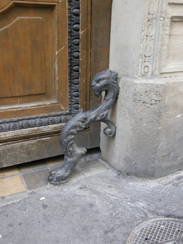 One of the beauties of cast iron — a material that I am very fond of — is that while molten, it may be poured or cast to take many forms. Once someone has made a pattern or mould of the design (the most expensive part of the process), each casting is relatively cheap. That is why we have so many inexpensive ornamental cast-iron products from the latter 19th and early 20th centuries. And because cast iron is so fluid, it can be made into elaborate shapes. Here are only a few of the many ornamental cast iron chasse-roues I have photographed in Paris.