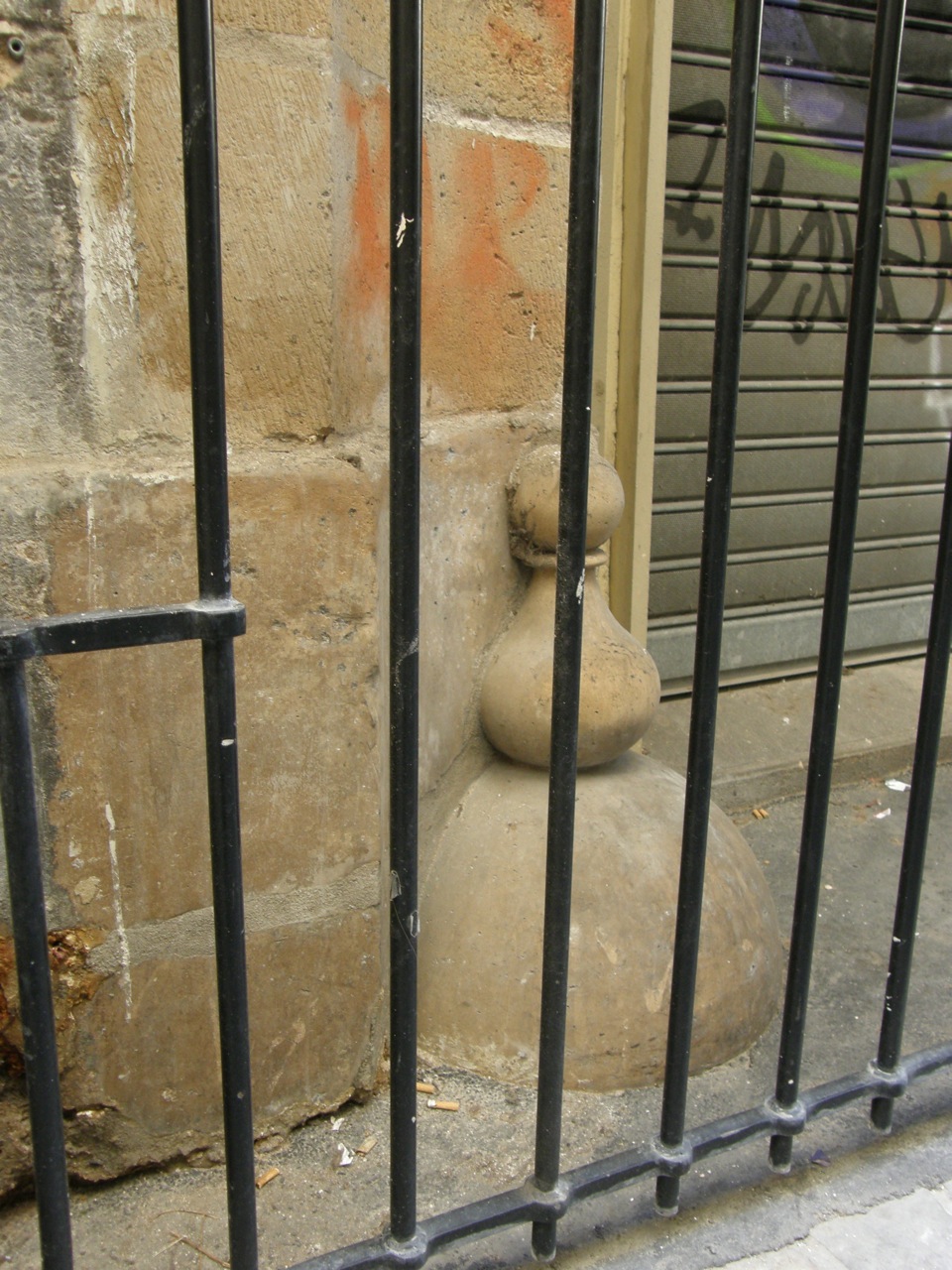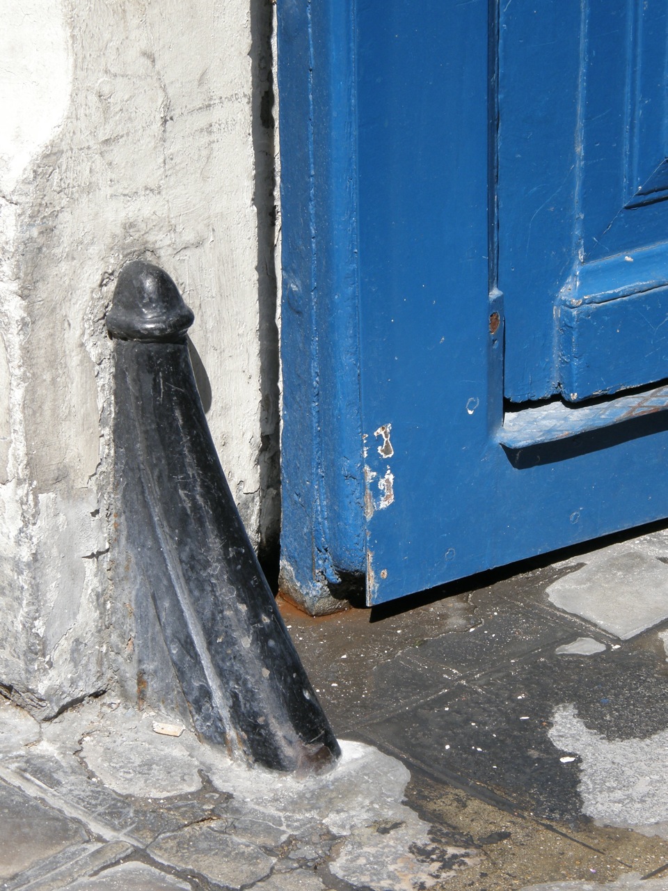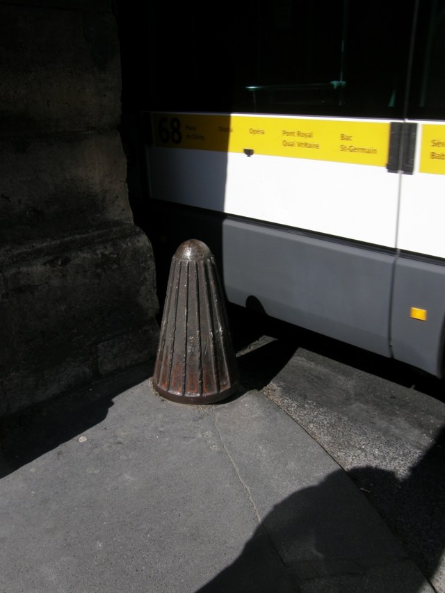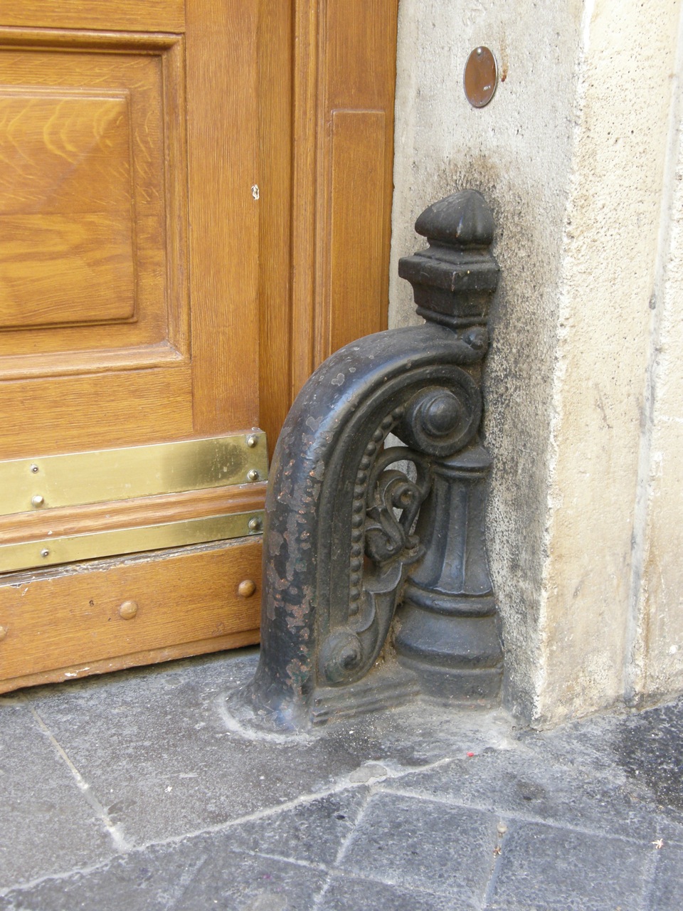 For contrast, consider this image. Although it is made of cast iron and sited in humbler circumstances, it does the same job as the chasse-roue at the porte cochère of a diplomatic residence.