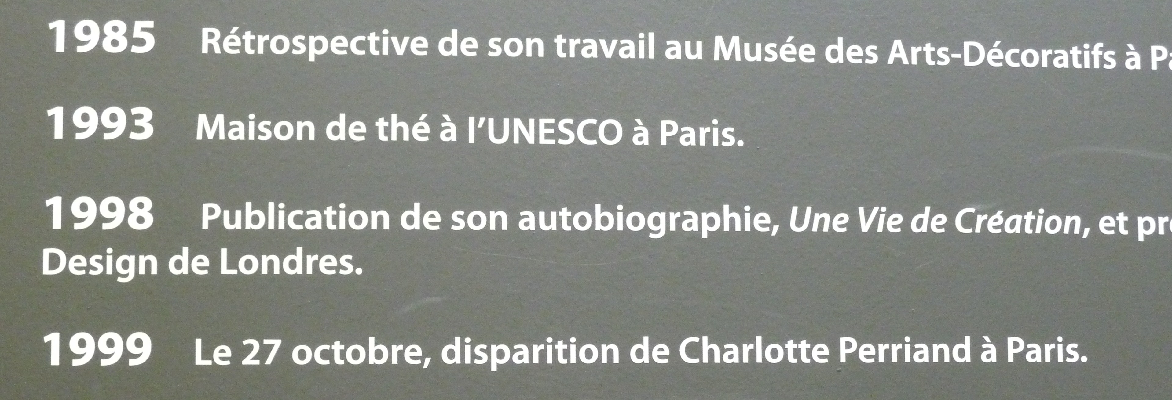 Even the wording of the chronology of her life written on a panel at the Bon Marché exhibit seemed to efface her. The last line reads, “1999 – disparition de Charlotte Perriand à Paris.” Yes, in French you can interpret the word “disparition” to mean death as well as disappearance, but did they choose that word because her work had “disappeared” into that of others?