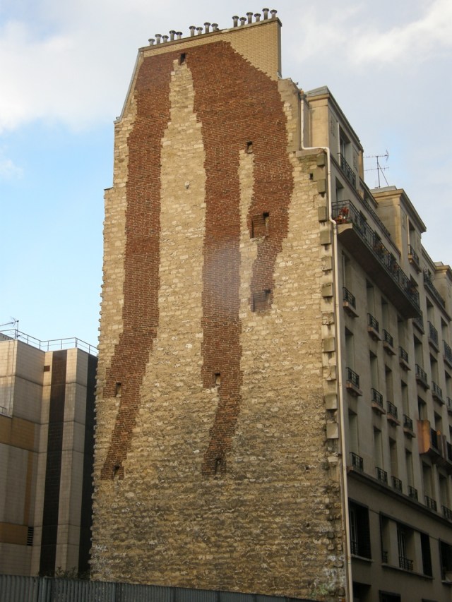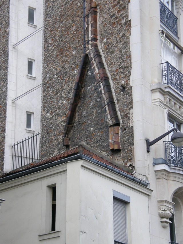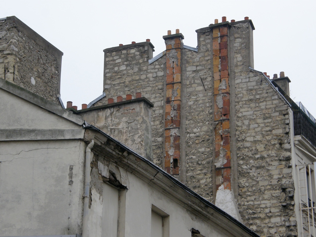 Once one knows what to look for, one finds that Paris is filled with exposed chimney tracks. In the photo below, at first glance it appears two exposed flues once converged into one and climbed to the roofline.