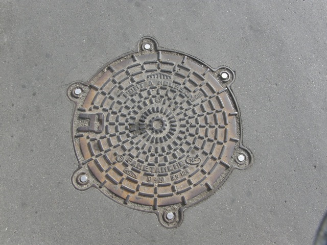 Time and countless feet have polished into high relief this seemingly simple cast-iron manhole cover (the French translation is regard de chaussée or plaque d’égout). The design consists of geometric shapes spaced in concentric rings. The closer we look, the more we see the honourable scars of time.