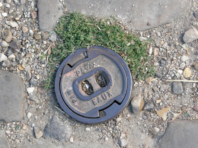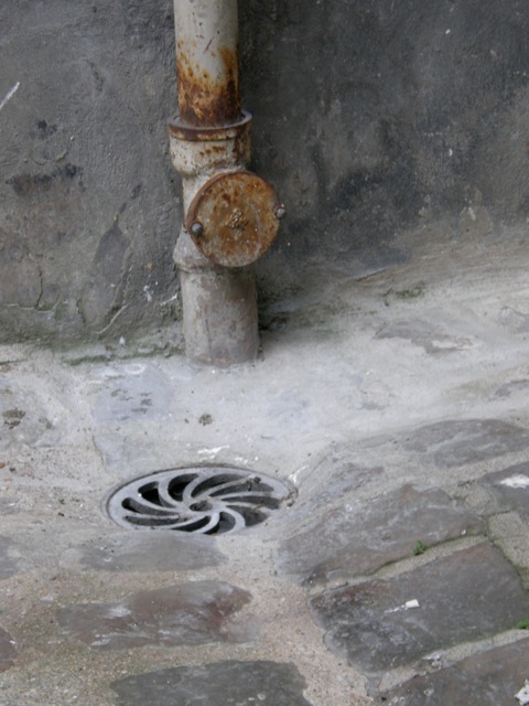 The cast-iron pipe disappears underground to join the larger water collection system. It collects the water that drains from streets, sidewalks, and courtyards and disappears down drain covers such as this one.