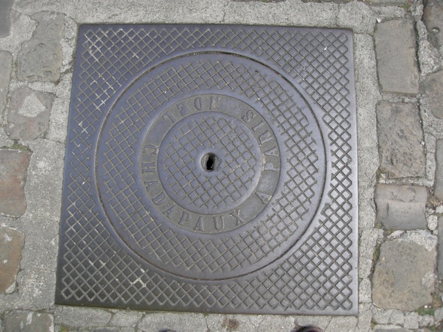 This one came from the foundry of Noel Chadapaux in Paris. Who was he? I am not entirely sure, but Google Books turns up his 1878 patent for “enamelling side culverts.” This is important work in the public health field. The name also led me to a website containing hundreds of photographs of French manhole covers.