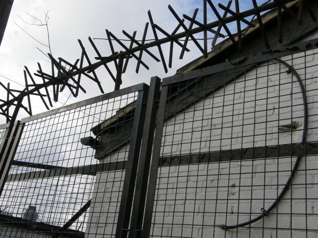 Close by, the same lack of welcome came from a fence that looked very modern, something stamped out and mass-produced to a standard industrial design. I guess we could call this one an off-the-rack barrier.