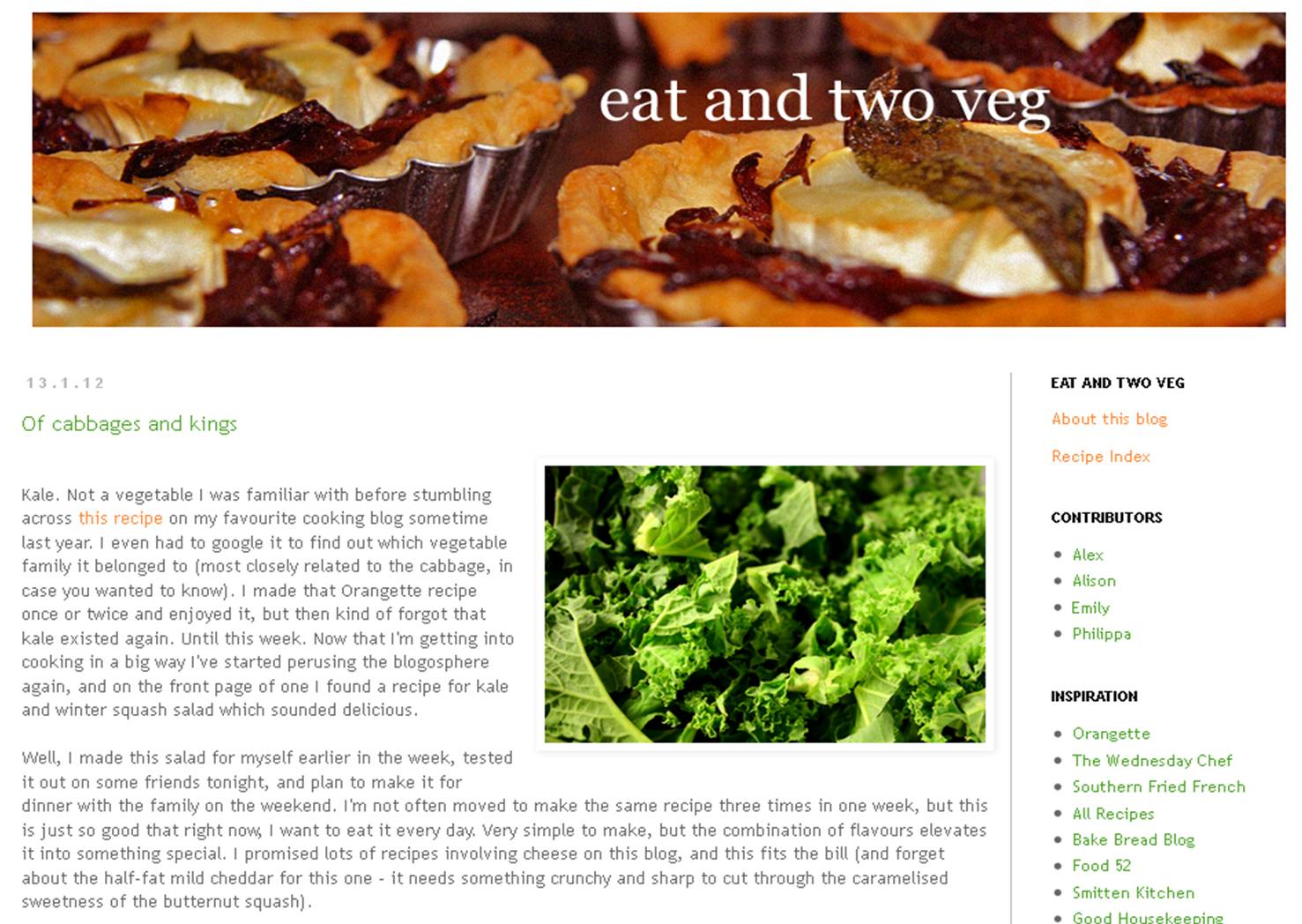 I’ll start with the blog. It’s very new still, but Alex has committed to trying one new recipe a week for the whole year, and my sister and I are weighing in with our ideas, along with some of Alex’s friends. So do drop by and take a look: it’s called Eat and Two Veg.