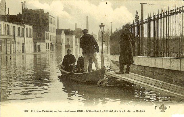 Of course, exactly 102 years ago today, people were probably wondering about that last bit, as Paris struggled through the great flood of January 1910. Once again, the city depended on boatmen, and pressed rowboats and punts into service to ferry people through the streets. And the city, in the end, did not sink.