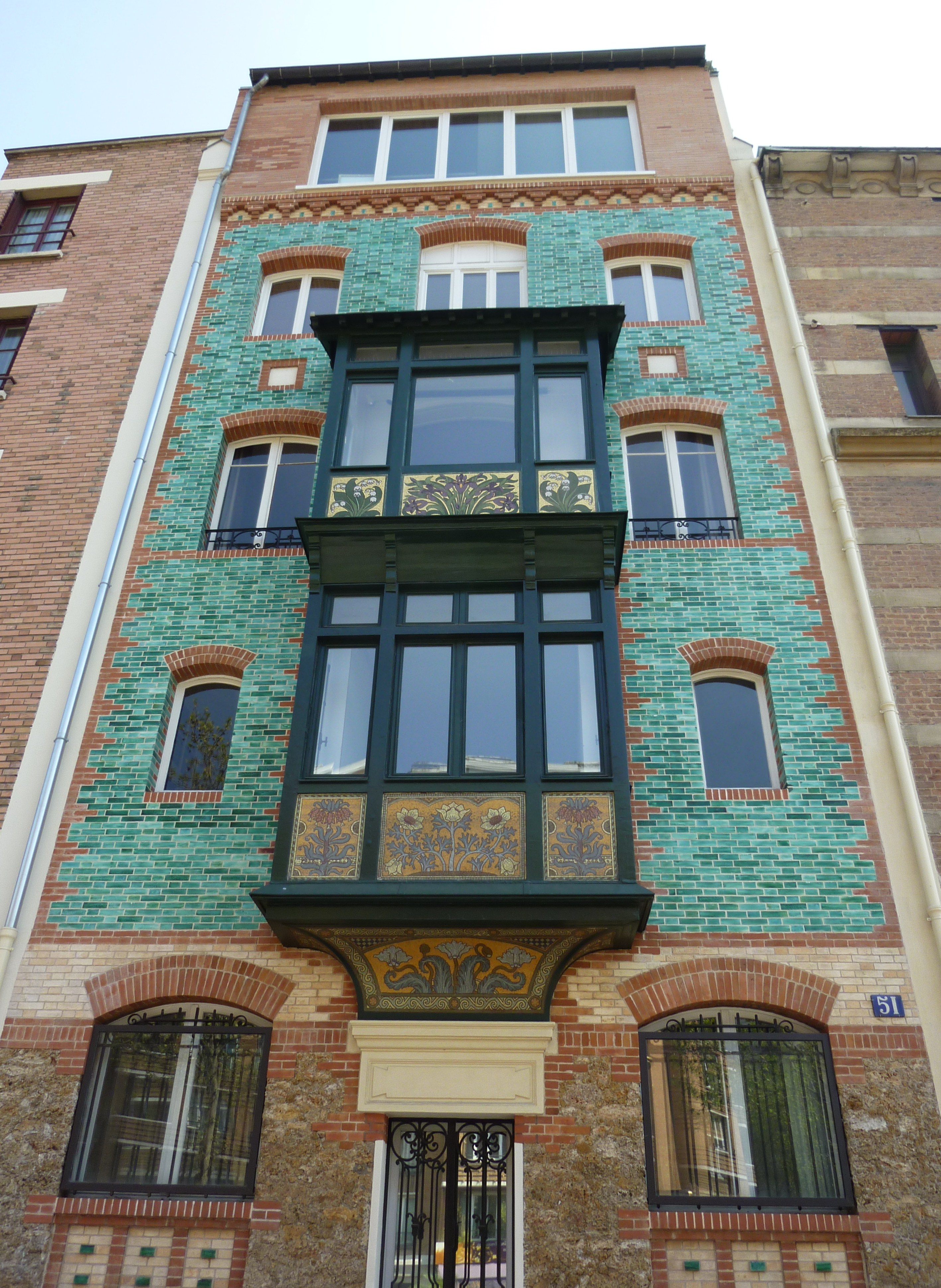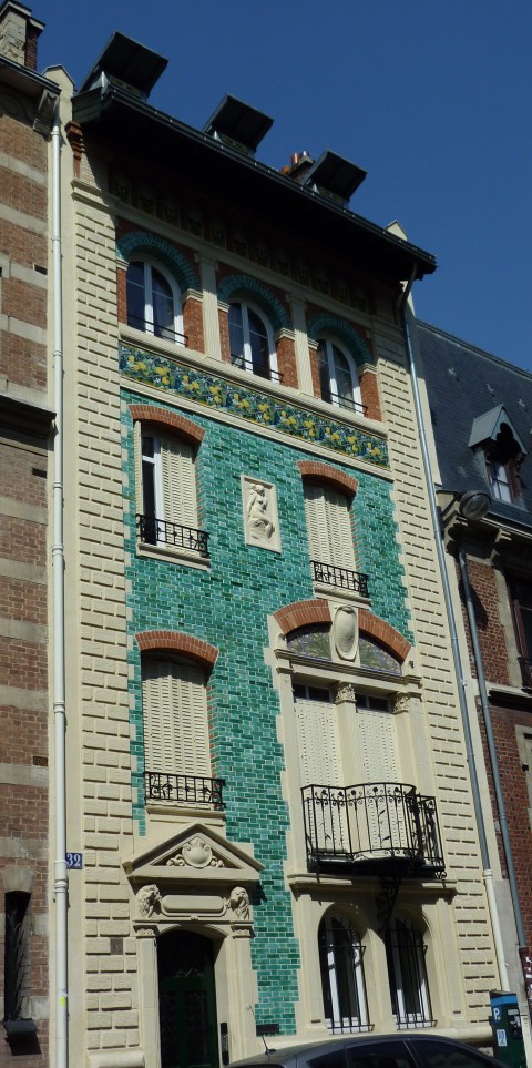 The other side of the house is visible at 51, boulevard Berthier. Same colour, but with a different treatment and different motifs in the mosaics. And yes, the bricks and tiles came from Loebnitz.