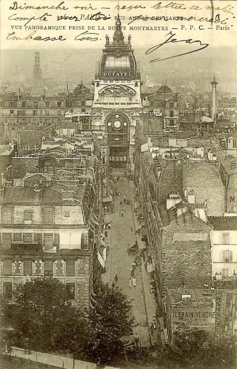 I was able to compile a short biography of Dufayel thanks to the Nineteenth Century French Collection at St. Michael’s College, University of Toronto. The photograph on the blog that inspired me, shown above, is now a part of Wikimedia Commons. That may not mean immortality, but many people who have never seen this blog have now seen that postcard image through Wikipedia.