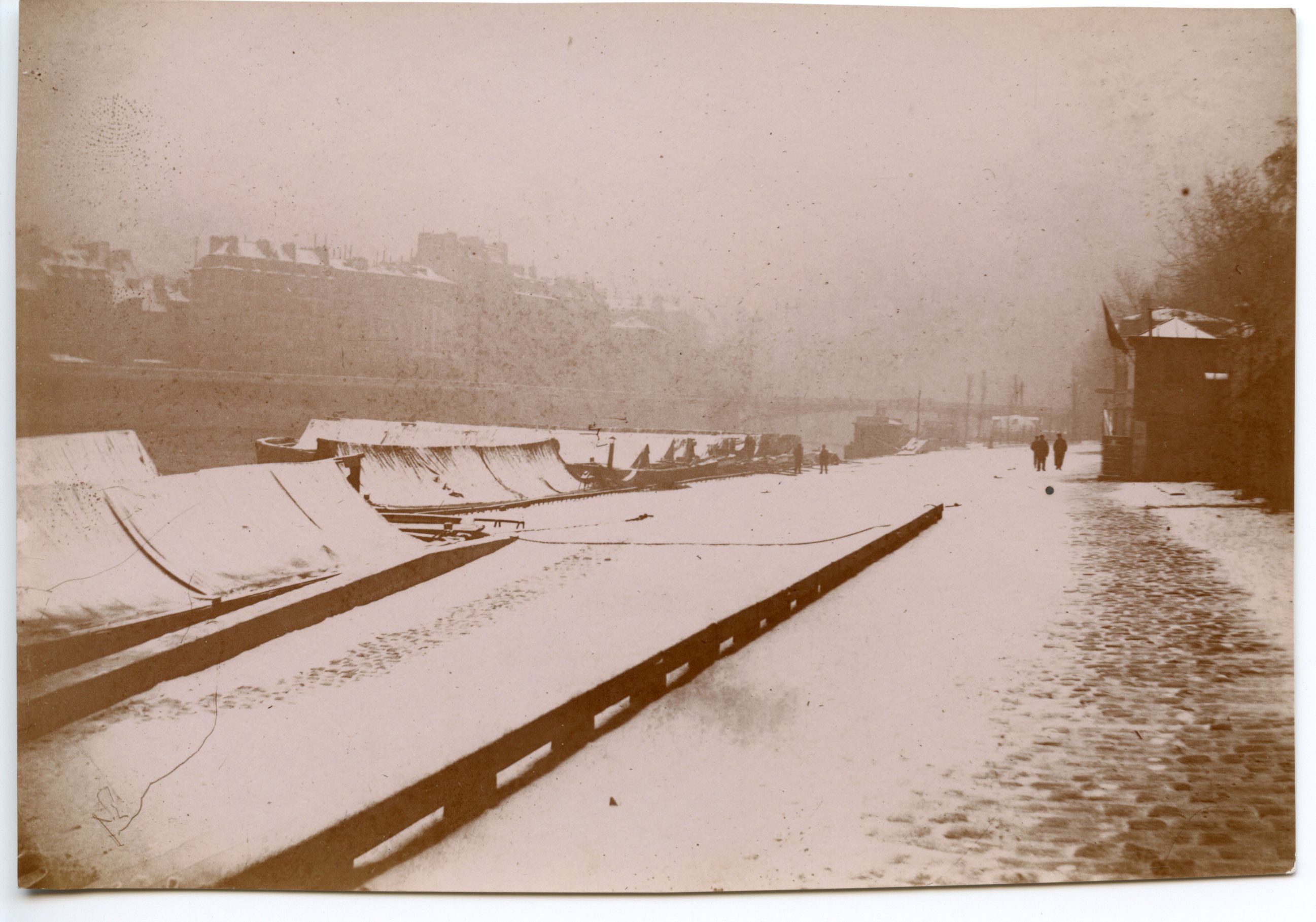 Faintly pencilled on the back are the words, “Le Mail au [sic] pommes.” What was that? Le Mail means a market area or mall; pommes are apples. It looked like one of the islands in the background. It turns out that there used to be an apple market near the Hôtel de Ville. Presumably the apples came in barges from Normandy, and perhaps there was some Calvados too, to keep everyone warm. For a view of the scene without snow, click here.