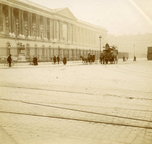 A dusting of light snow seems to reduce the vastness of the Louvre and make it seem only a backdrop to an urban street scene: tram tracks, a bicyclist, some pedestrians, a small horsedrawn carriage, and a large omnibus drawn by four horses. When I had scanned the photo and enlarged it on screen, I noticed a passenger on the unprotected top level; it might have been colder, but it was cheaper up there. And behind the omnibus, a man with a furled umbrella. And again the openness. Snow seems to make people stand out in higher relief.