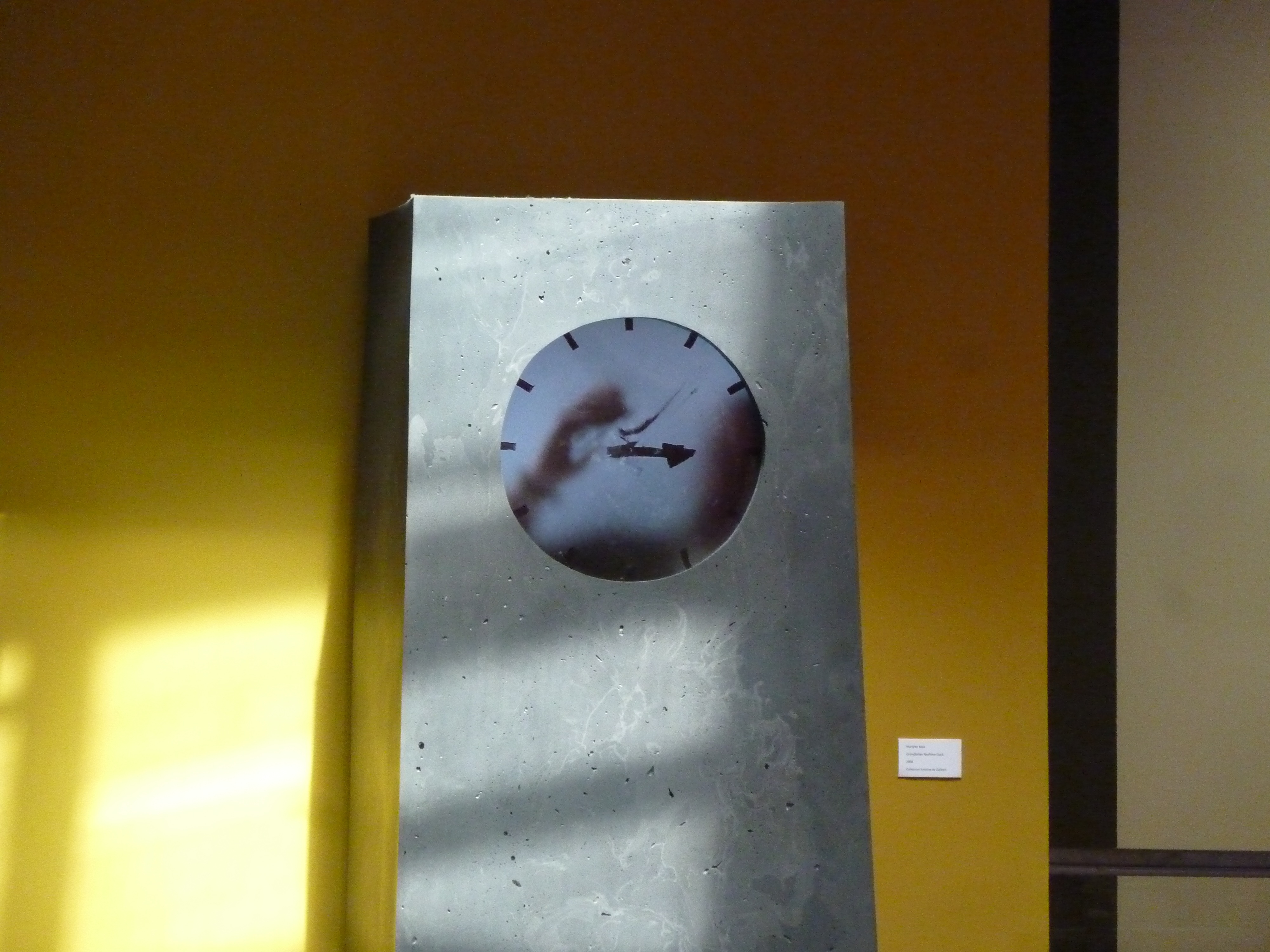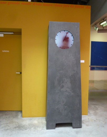 Of all the clocks in Paris, perhaps the most extraordinary can be found in the Maison Rouge, where we went to see an exhibit of neon art. In the café near the entrance to the toilets, there is a clock with what appears to be a man standing inside.