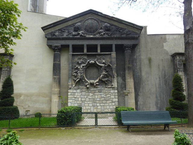 It is part of the long-gone Tuileries Palace. It was one of two clocks in the centre of the façade – one facing the Champs-Elysées, the other facing the Louvre. The building was torched in 1871 and stood as a burnt-out hulk for 11 more years before it was finally torn down. Somebody (Georges Cain?) saved this bit as part of the city’s history and installed it in this quiet corner of the Marais.