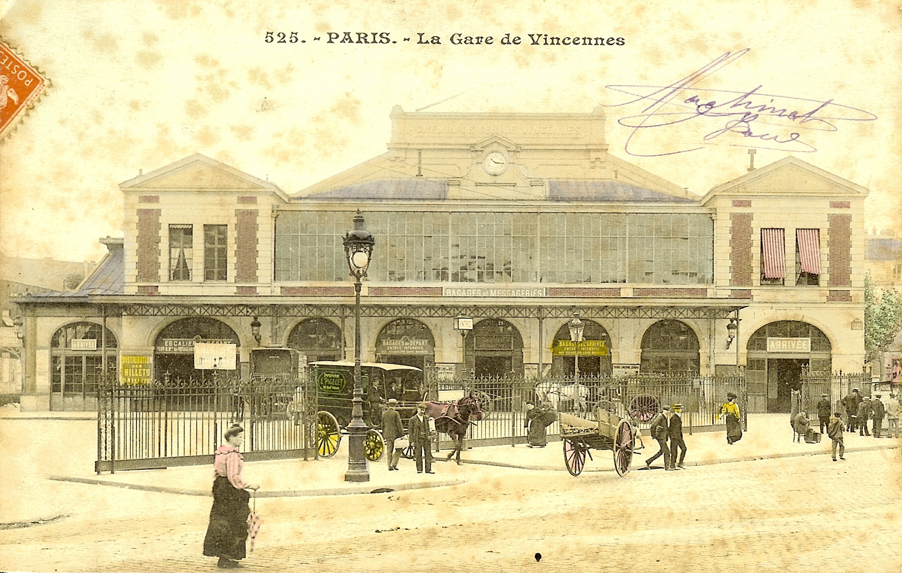 The second shows a closer view; the postcard was sent in 1907. Across the top of the building is written “Chemin de Fer de Vincennes.” Arrivals on the right and far left, departures second on the left and up a staircase (Escalier du Départ), baggage and parcels in the middle.