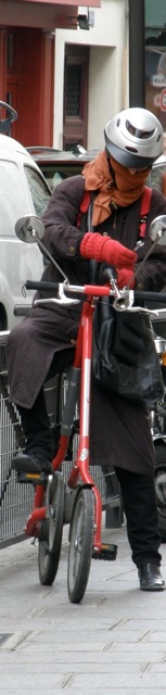 Perhaps in a few years the youngster will have a bigger two-wheeler and a more avant-garde safety helmet such as the one below. Did you notice the belt drive on this bicycle? It is a folding bike. I wonder who made it.