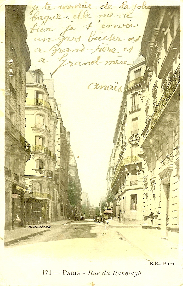 Postcards of Paris monuments are a dime a dozen, but postcards of ordinary Paris streets are more unusual and interesting. Here is one of the rue du Ranelagh in the 16th arrondissement. This was the street that Philippa lived on when she was a student and au pair to a French family. This shot shows the intersection with rue Davioud (someone has helpfully written it in), a few blocks west from the building she lived in (No. 28).