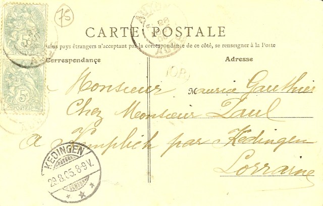 The address on the other side is written in a more adult hand. There is a name, but no street address, and it was going to Kemplich in Lorraine, a region that at the time was part of the German Empire, having been taken over in 1871 at the end of the Franco-Prussian War. The card had to go through Kedingen in Germany to reach its destination, and there is an extra postmark that indicates this step in the voyage. Little Anaïs’s family was divided by a border.