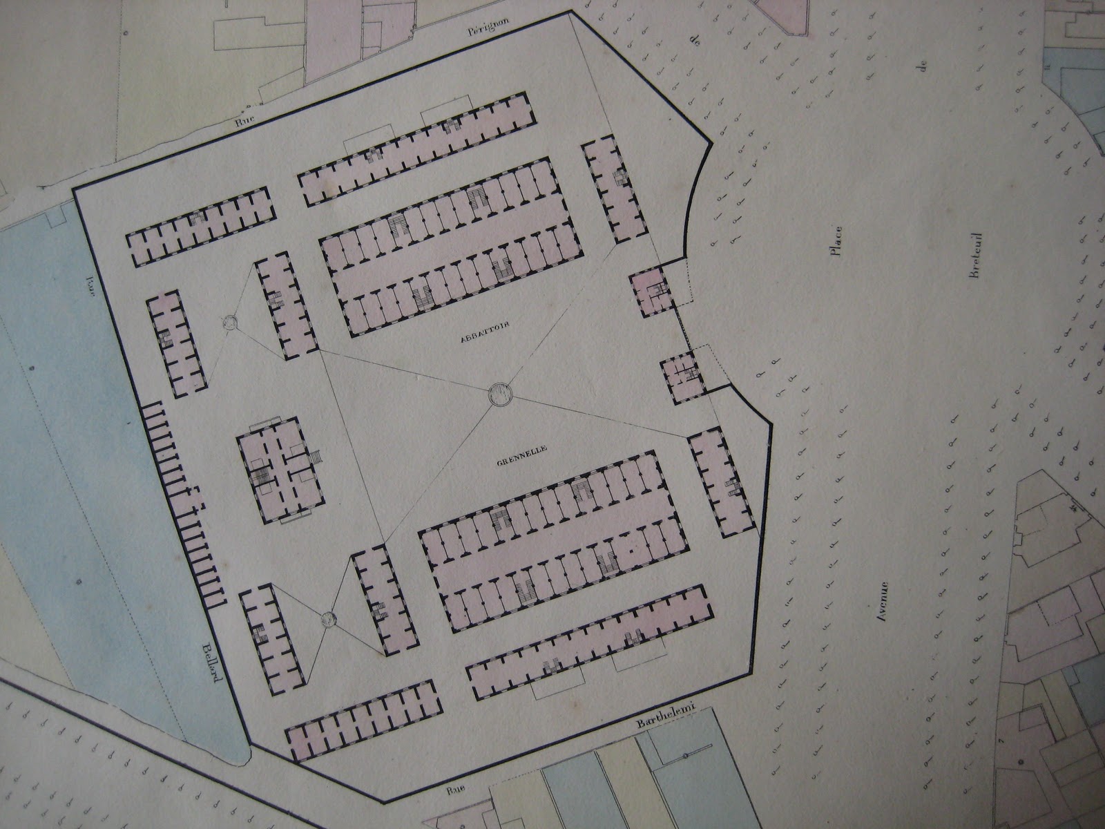 One of the five abattoirs was called Grenelle; it was also known as the Abattoirs des Invalides or Abattoirs de Vaugirard. It was a massive complex with 16 buildings covering about eight acres, with its own water pipes feeding 174 taps. Abattoirs need lots of water, particularly one with 48 échaudoirs of scalding water.